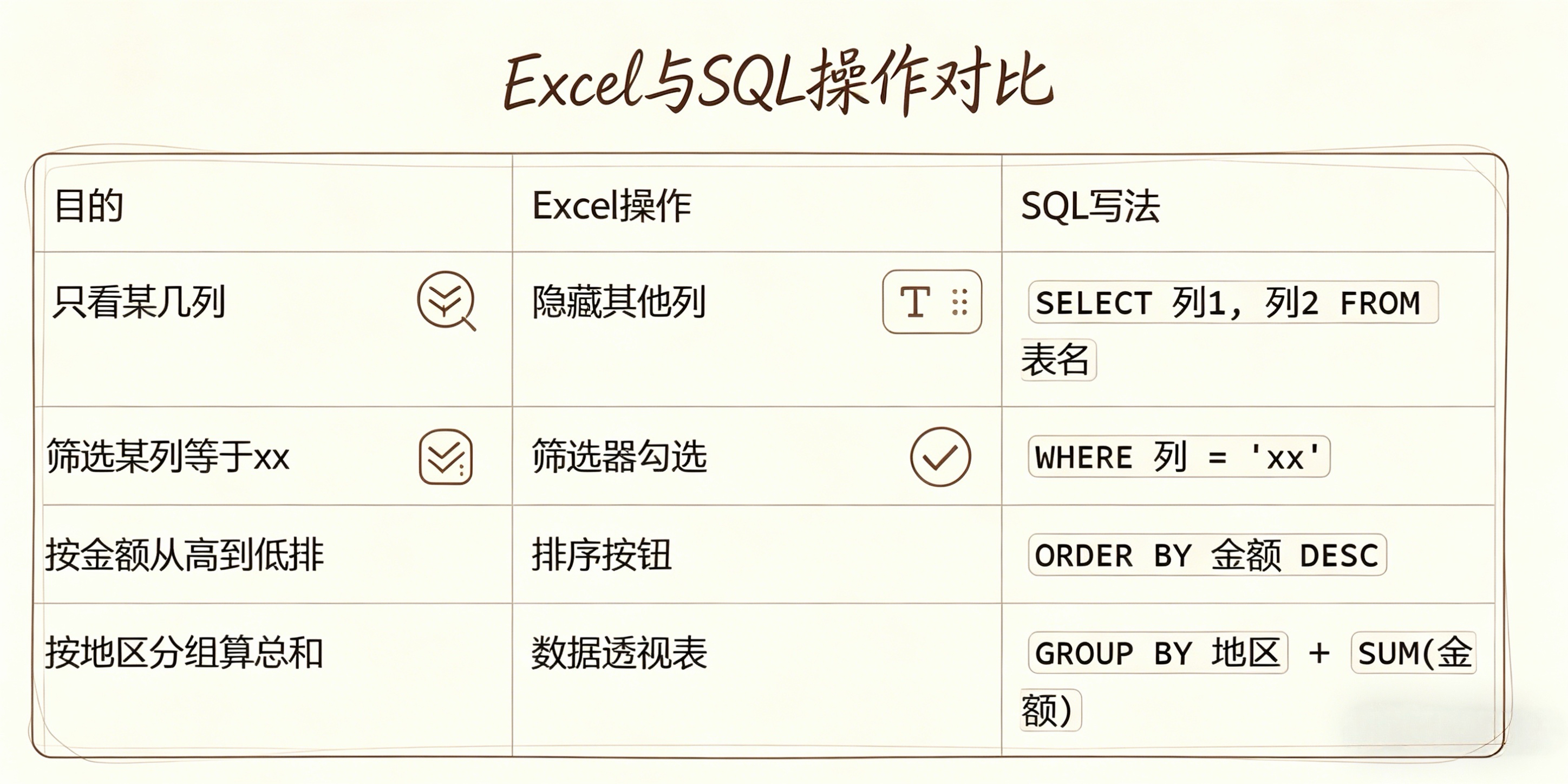 后来我发现,SQL里的很多操作,其实就是Excel里我天天用的那些。