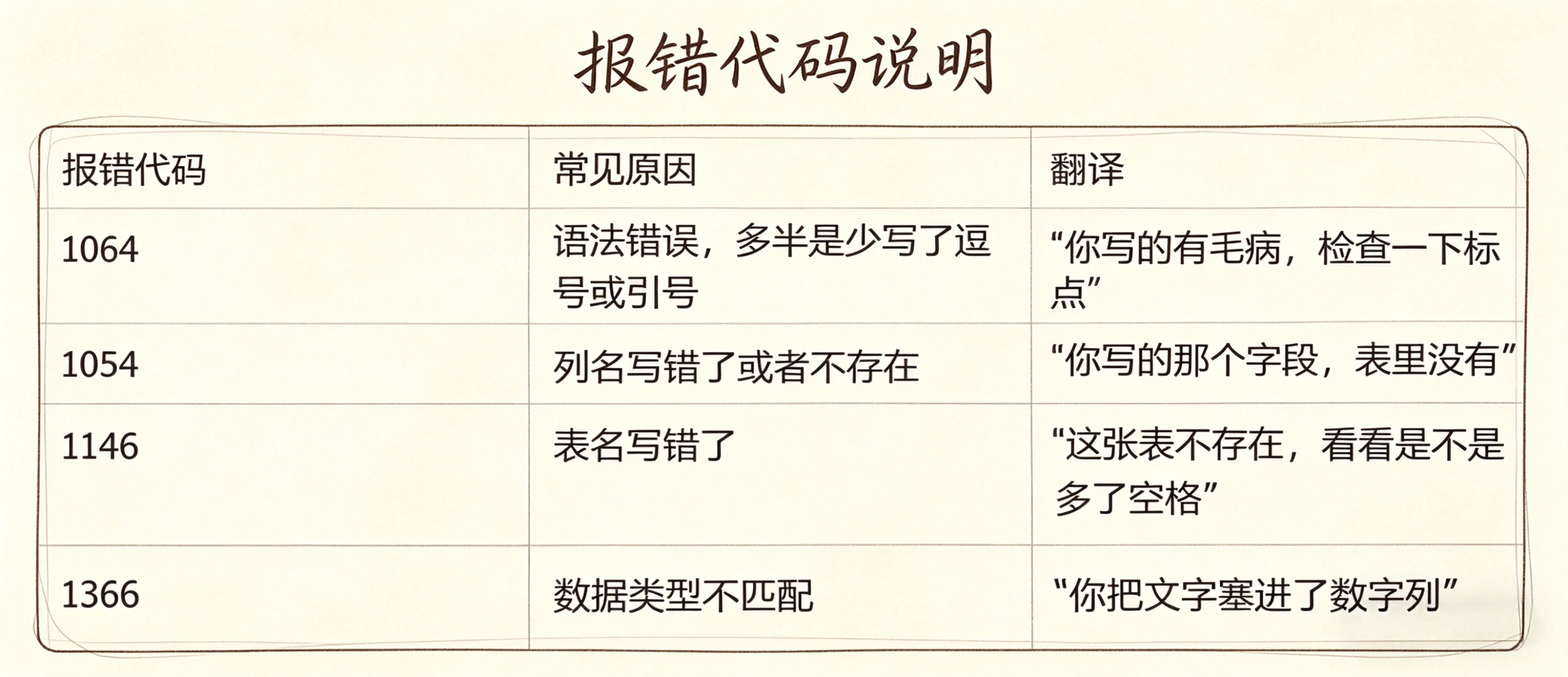 后来我学聪明了。每次遇到报错,就把报错代码、我的SQL、实际原因、解决办法记在一个文档里。一个月下来,攒了二十多条。