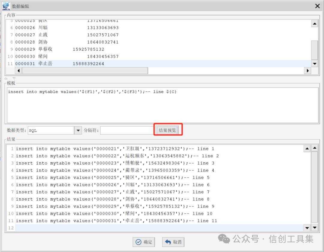 第四步:在弹出的对话框中点击“结果预览”。友情提示:这时候大家可以通过模板调整表名,在数据外部添加函数,甚至可以生成update等语句。