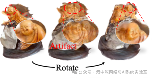 图 1 在反射或透明表面上,轻微的位姿估计误差也会导致多视角下几何结构的不一致与显著的渲染伪影。