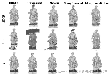 图5 新视角合成结果:我们的数据集在Diffuse材质上表现良好的算法,在Transparent和Metallic材质上出现了严重的结构缺失和悬浮物堆砌。