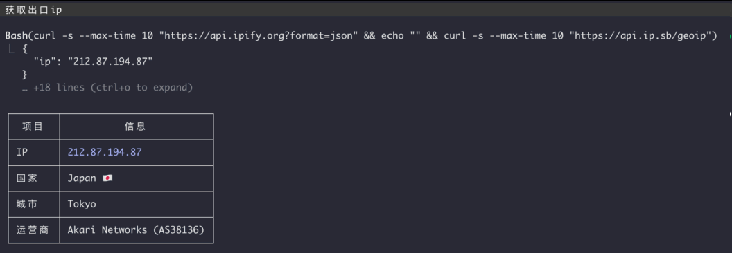 我这里简单编写了一个用于获取当前出口IP的skill(或者你用AI来生成,偷懒了)。