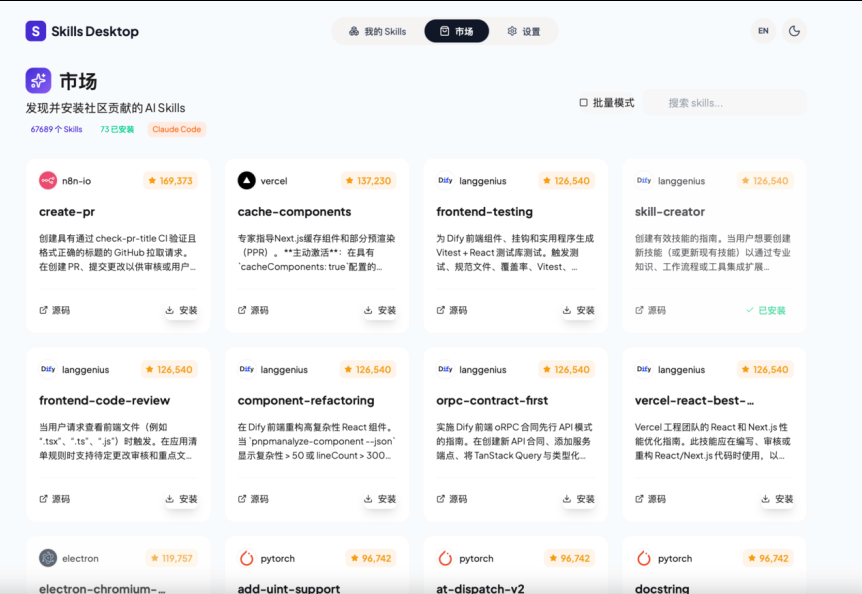 现在各大AI GUI工具、专业Skills平台、“龙虾”系列平台等均集成大量的skills,比如Skills Desktop、WorkBuddy、QClaw、扣子 Coze 技能商店、ClawHub (Kimi)、InStreet 龙虾社区、OpenAI GPT Store、ClawHub (OpenClaw)、Claude Artifacts 灵感页、skills.sh[1]等等,部分截图如下。