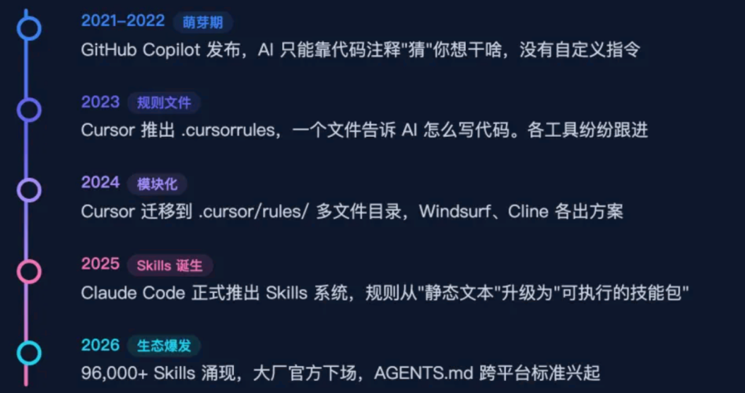 定义:Skills是面向 AI Agent 的领域专属扩展包,本质是结构化的 SKILL.md 文件,注入专家知识 + SOP + 工具脚本。通俗来讲就是告诉ai要做什么,要怎么做,是一份 AI Agent 的说明书和工具箱,让AI按照我们规定的流程和方式去运行。skill技术的演进时间线(2022-2026)如下所示。