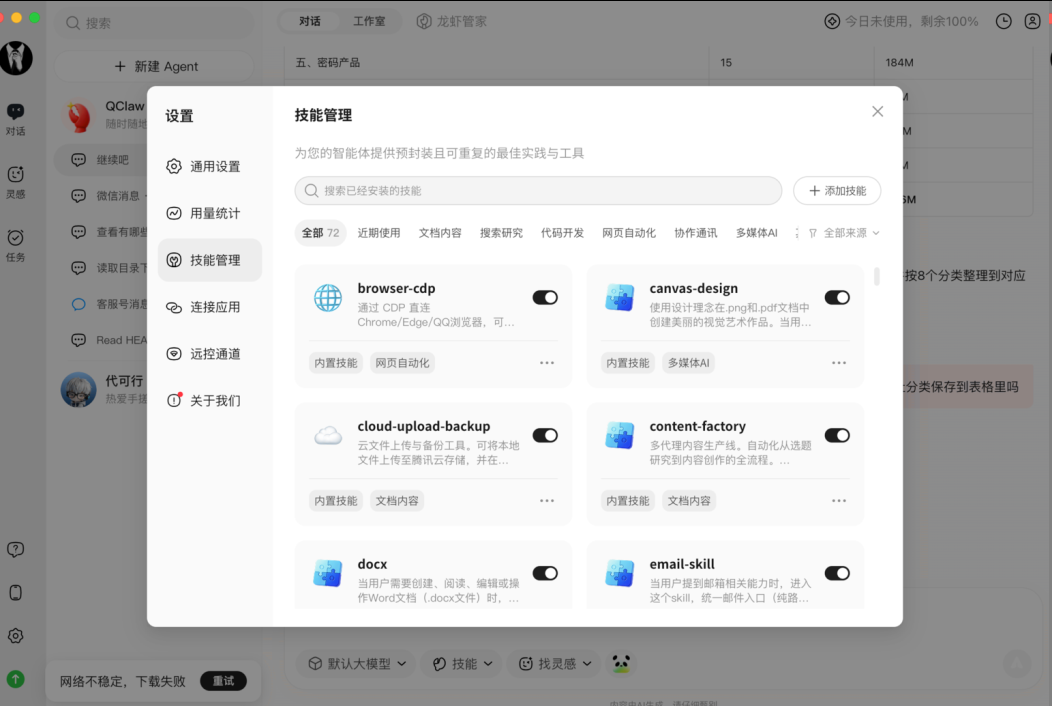 从社区或者相关站点、仓库中下载 skills,然后集成到 Agent 中。在好多桌面程序中集成skills。