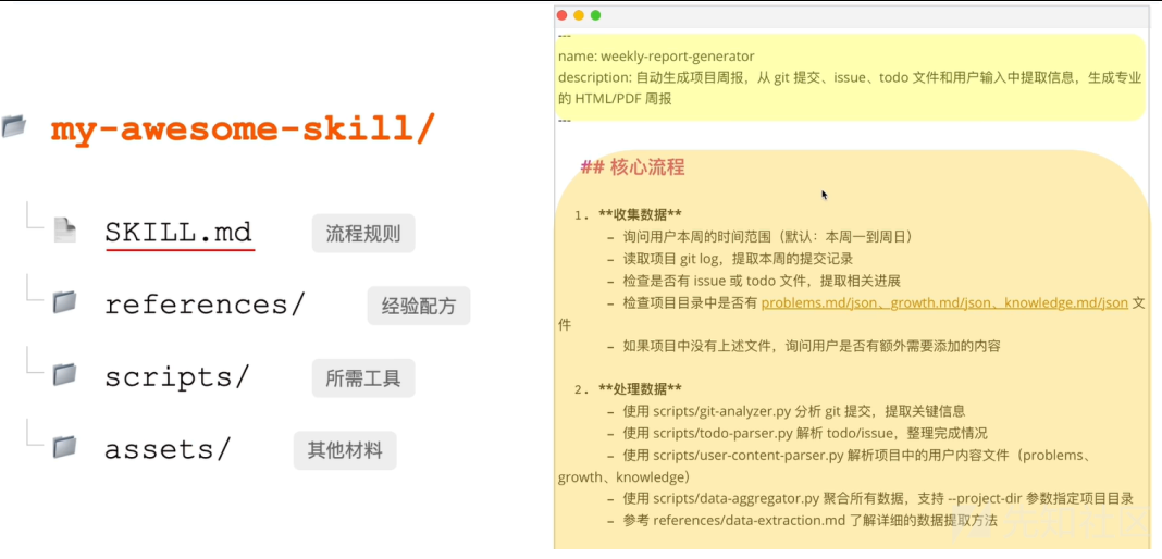 一个skill长啥样呢?完整的skill是文件夹的形式,通常包含以下几个部分: