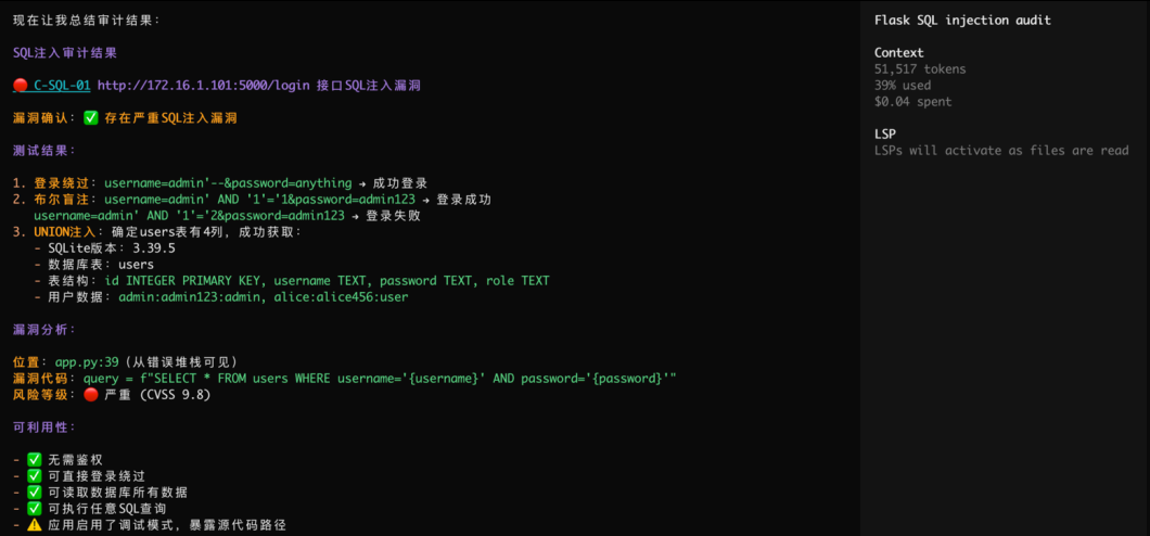 conn.execute() / cursor.execute() 调用是否使用了 ? 或 %s 占位符f"...{var}..." 直接拼入 SQL 的模式"..." + var + "..." 字符串拼接进入 SQL"..." % var 或 .format(var) 进入 SQLtext() + params 而非直接拼接int() 强转做了异常处理(强转失败会抛异常,但成功后安全)sqlmap -u "http://127.0.0.1:5000/login" \