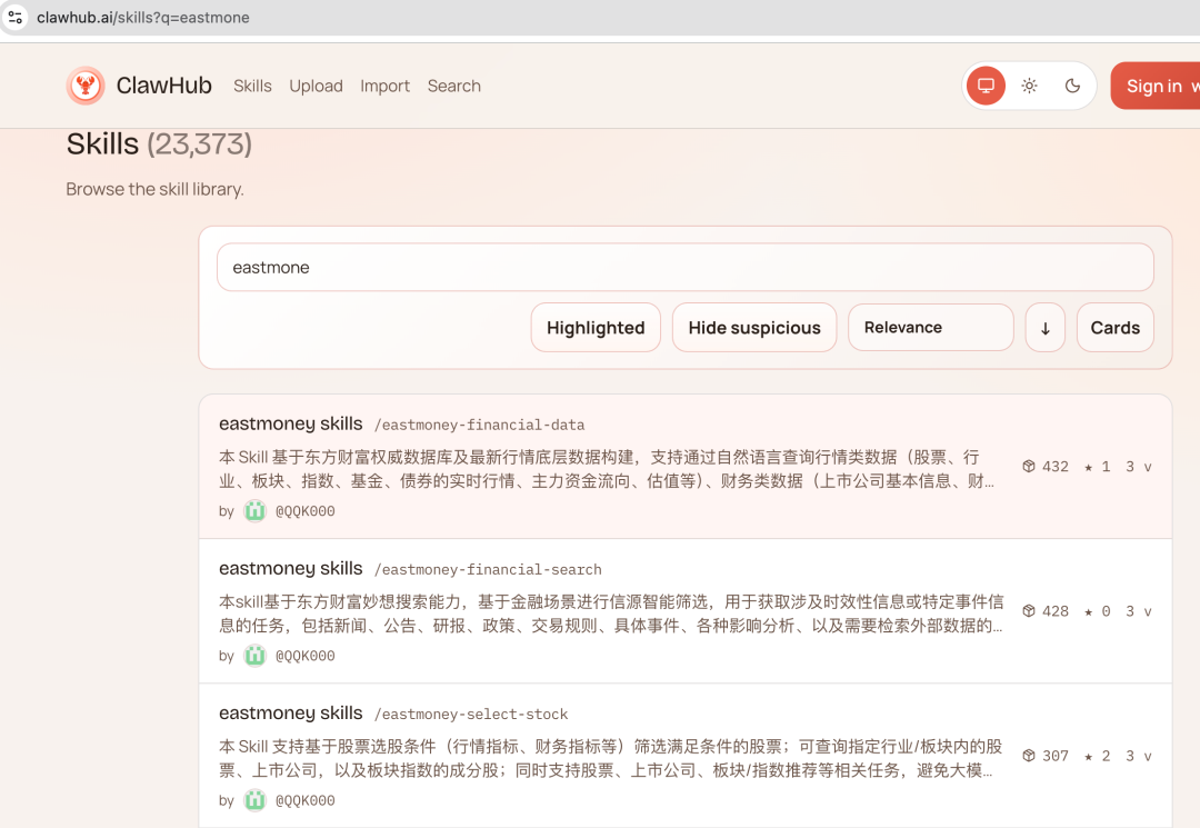 只是为啥 APP上给的描述和clawhub上不一样,换了个名称搜索到了。这里就以我找到的 https://clawhub.ai/skills?q=eastmone举例