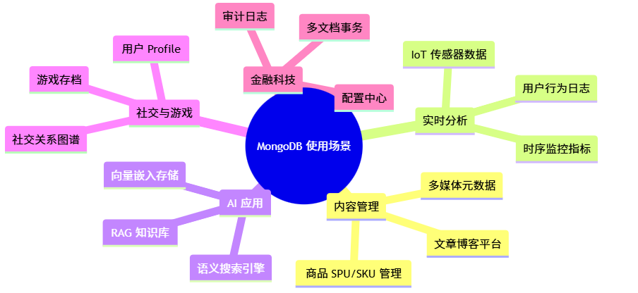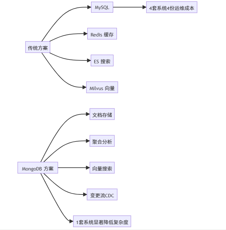 **小结**:对于中小团队,将 MongoDB 作为"多能数据库"可以大幅降低系统复杂度。但超大规模生产场景仍需按需拆分专业组件。