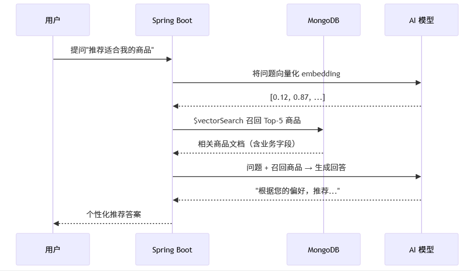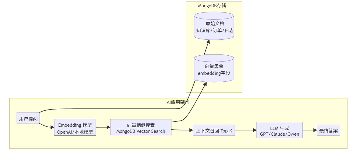 **小结**:相比单独部署 Milvus 等向量数据库,MongoDB 的最大优势是**向量与业务数据同库**,省去数据同步管道,查询时可同时过滤业务条件(品类、价格、库存)再做向量召回,精度更高。