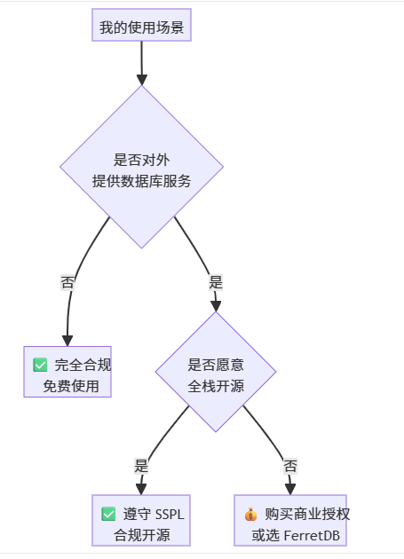 | 作为云数据库服务对外售卖 | ❌ 必须开源全栈或商业授权 | 触发 SSPL 第 13 条 |
