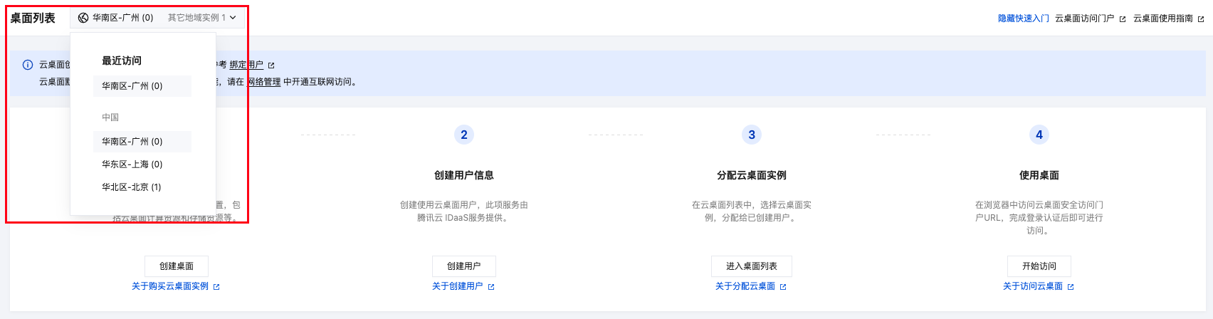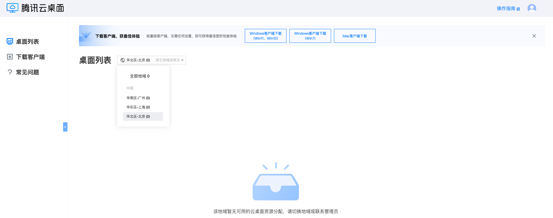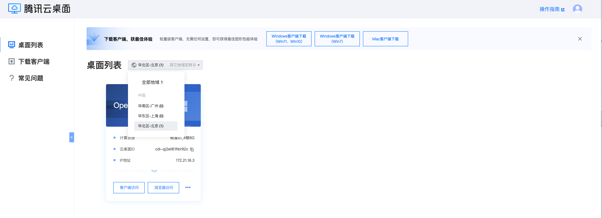 创建完毕后,根据提示,你会来到的云桌面列表,此时需要注意区域选择,可能你选择是北京,此时默认选择的是广州,如果没有看到自己的云桌面的话,可以检查一下区域是否正确。