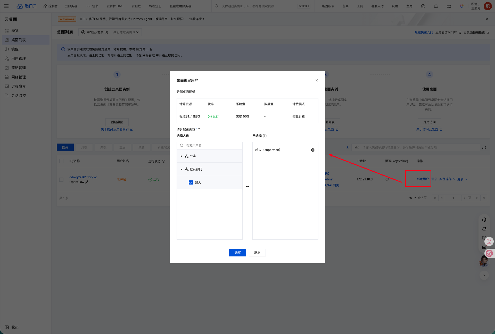 由于我们刚刚新增了用户,但还未为你配置可用的云电脑,我们就需要返回腾讯云控制台 > 云桌面 > 桌面列表,为该 云桌面 配置用户。