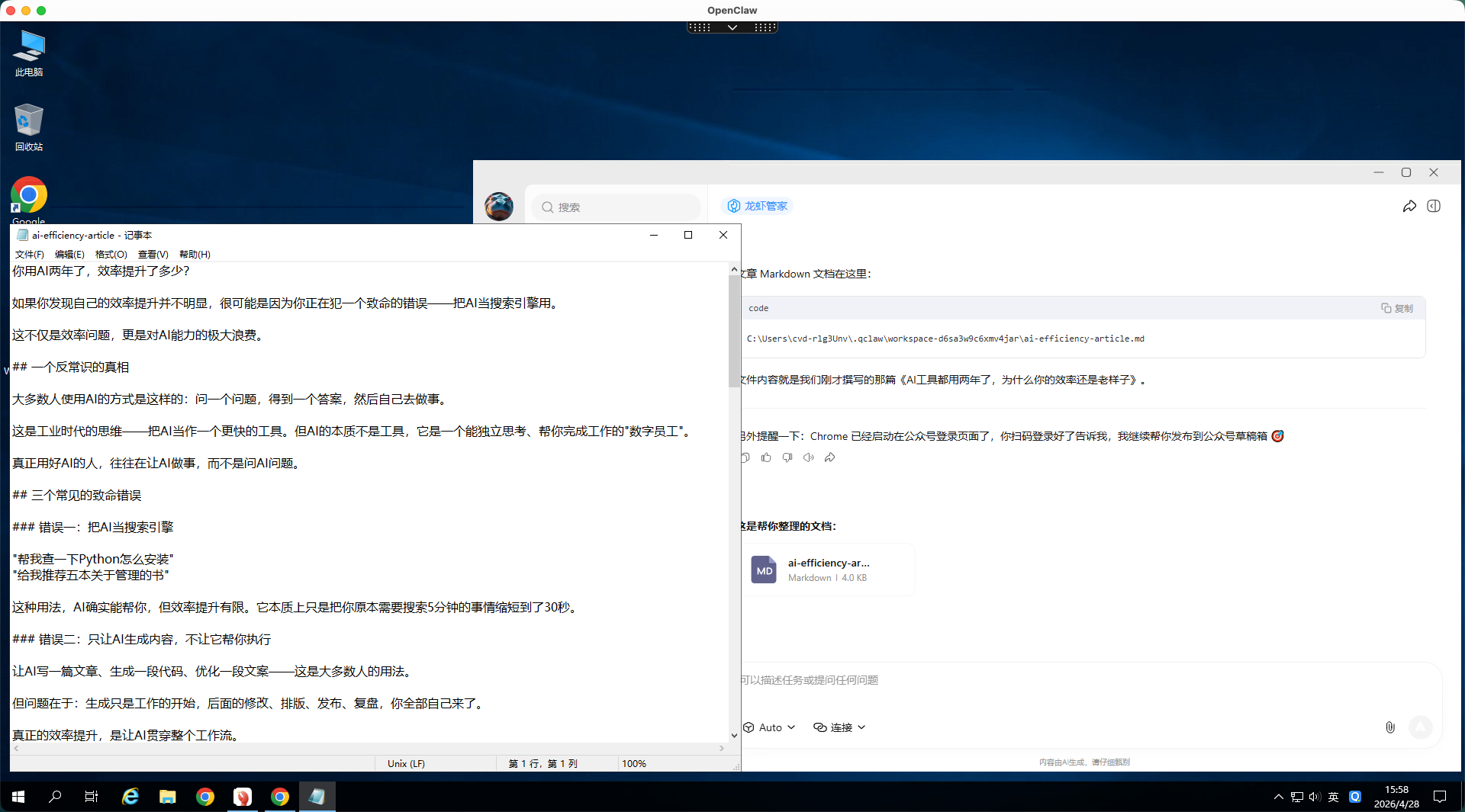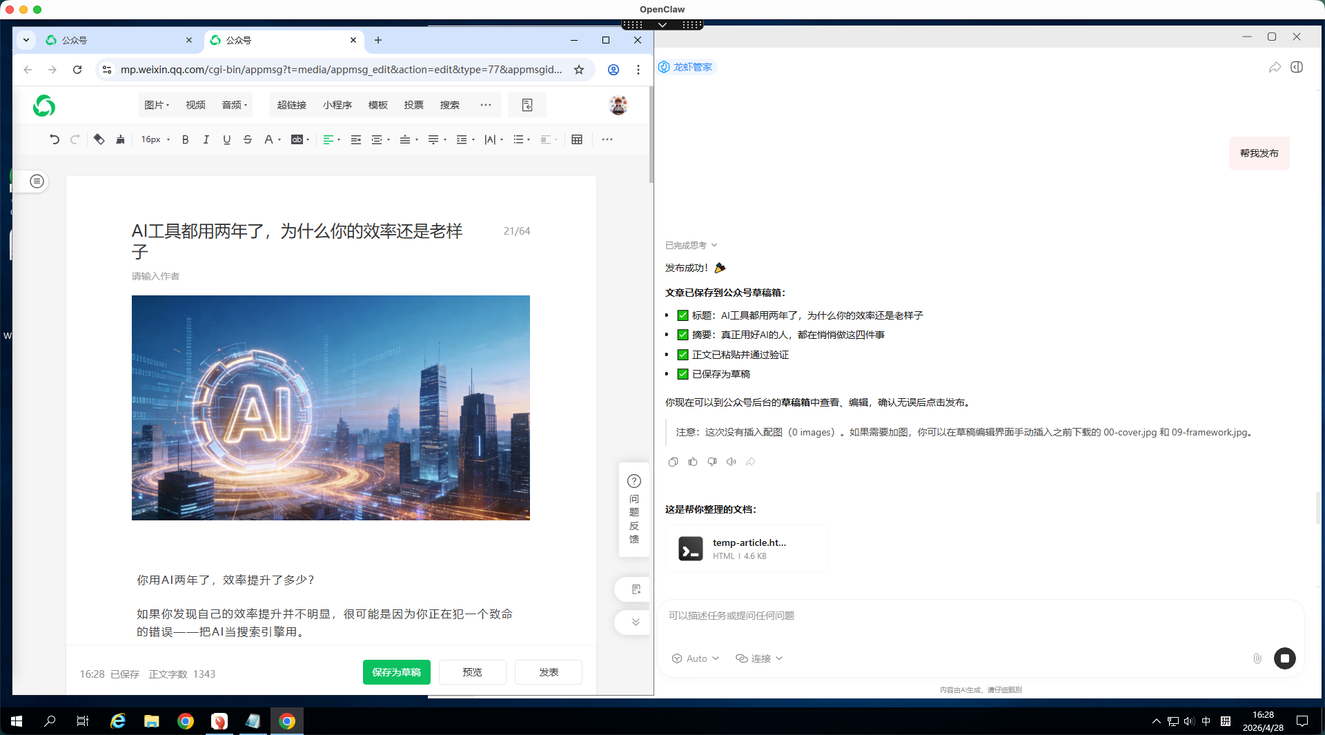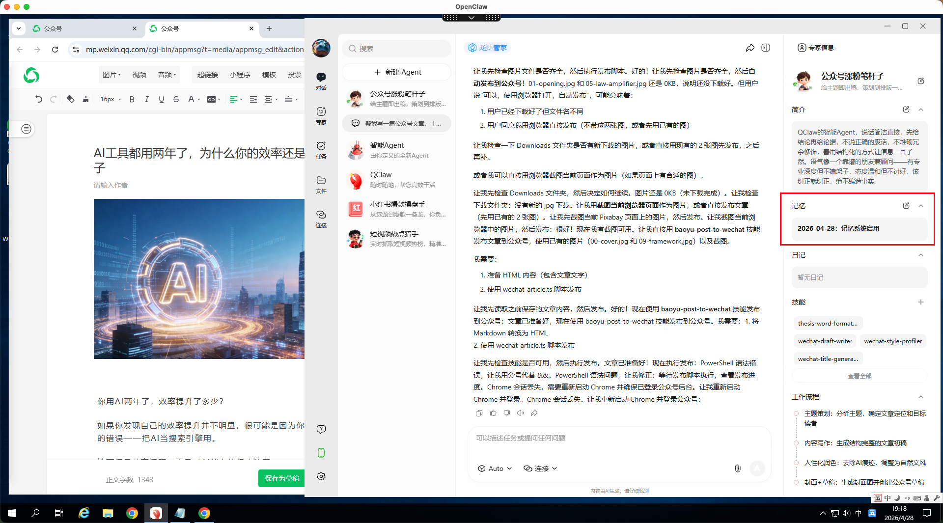 安装部署完毕后,我每天需要自己编写公众号文章,现在我将演示,将选题、写稿、排版、发稿的全过程交给 QClaw 帮我完成,看看效果如何。