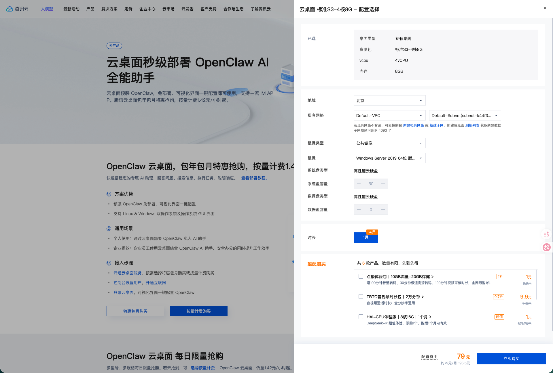 腾讯云目前有一个特惠活动,79元首月 4 核 8G,对于新手而言是一个不错的选择,当然,如果你只是想测试一下效果,然后再决定是否使用的话,那么你也可以选择按量付费,同等配置的价格在 1.5元/小时。