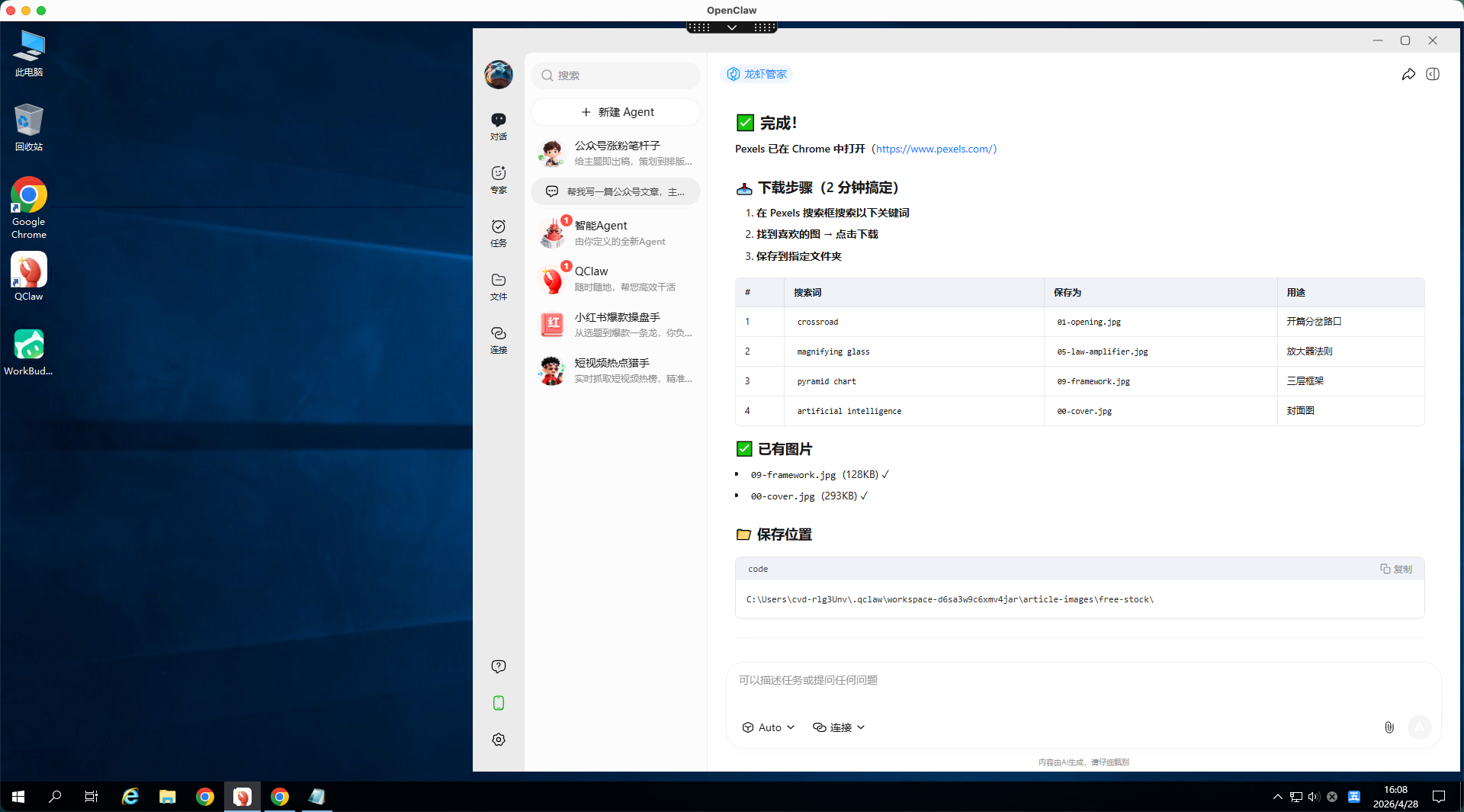 请帮我在每个章提取 1 个关键字,并在开源免费网站,包括但不限于 unsplash、pixabay、pexels,搜索关键字并下载图片,并在每一章开头添加配图。文章写完 → QClaw → 根据关键字在开源网站上下载图片 → 插入正文