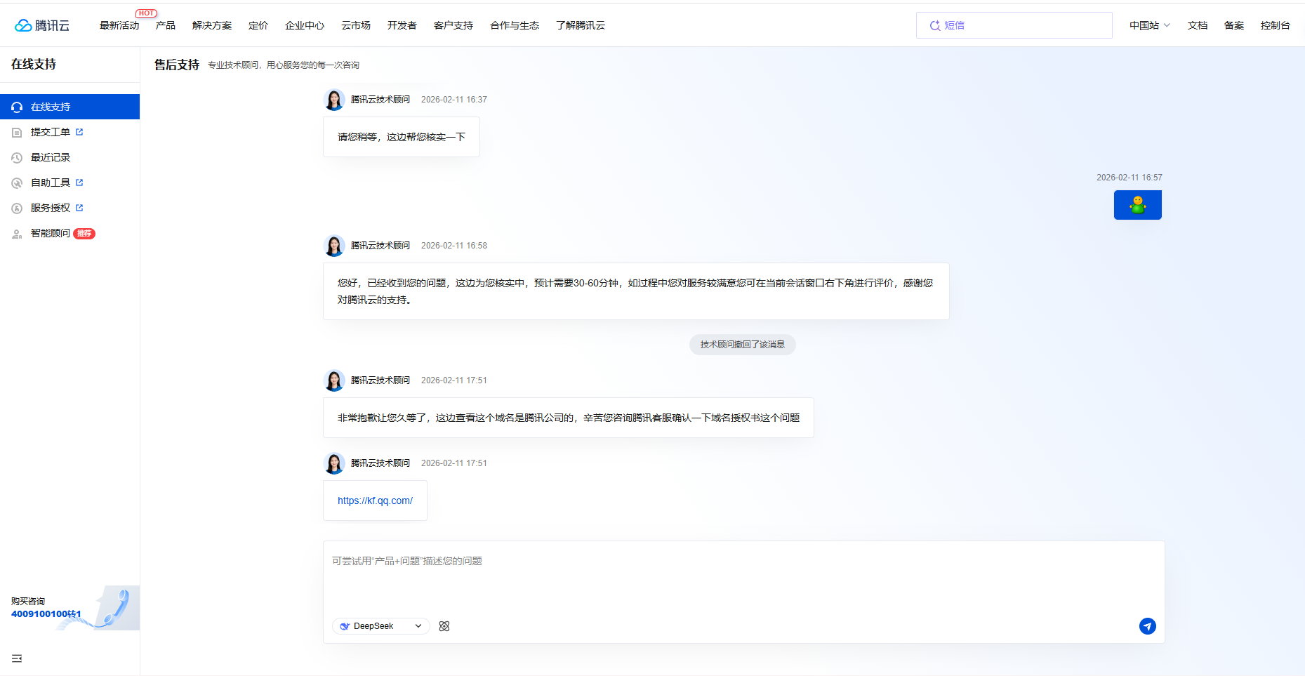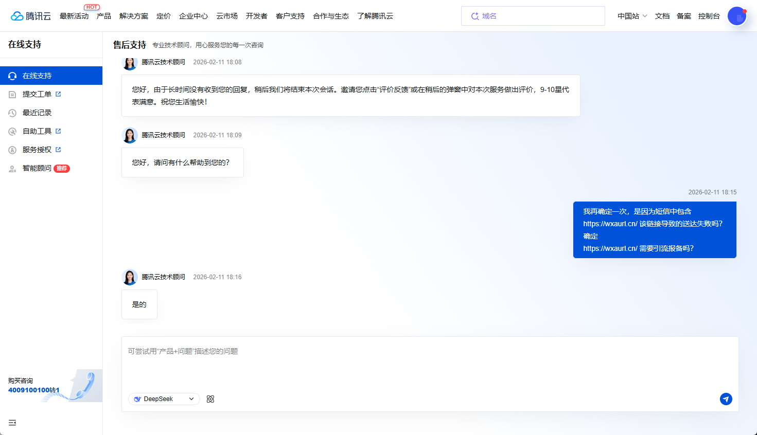 发送了短信有些用户收不到,看腾讯云短信后台有很多送达失败,问了在线客服说是因为引流信息拦截导致的失败。 短信内容中有调用微信小程序服务生成的小程序快速跳转链接,例如 https://wxaurl.cn/xxx 客服说需要引流报备,然后我去操作,发现需要wxaurl.cn域名主体授权书,然后我问客服哪里能申请,客服整整核实了一个多小时,最后说让我找腾讯客服。我不太清楚这属于那类问题。 有人知道去哪申请吗?😭😭