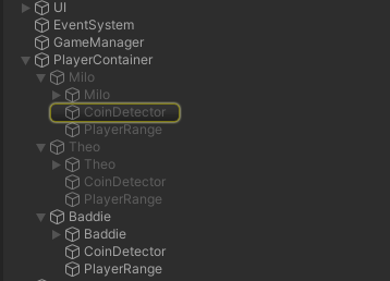 它只检测第一个游戏容器的(Milo)‘硬币检测’游戏对象(即使它已被停用),并且不识别坏蛋playerContainer中的‘硬币检测’碰撞游戏对象(玩家已选择使用该游戏对象)。