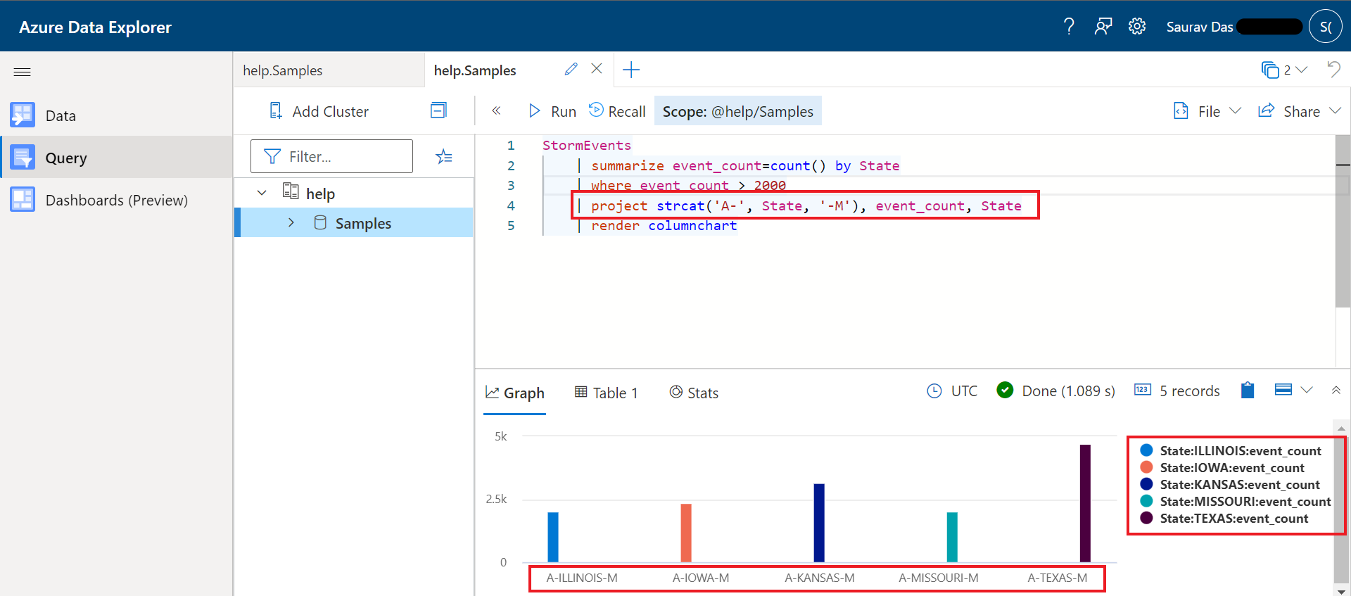 | render columnchart我尝试了类似于Azure数据资源管理器中的示例数据,并实现了所需的结果,如下图所示。