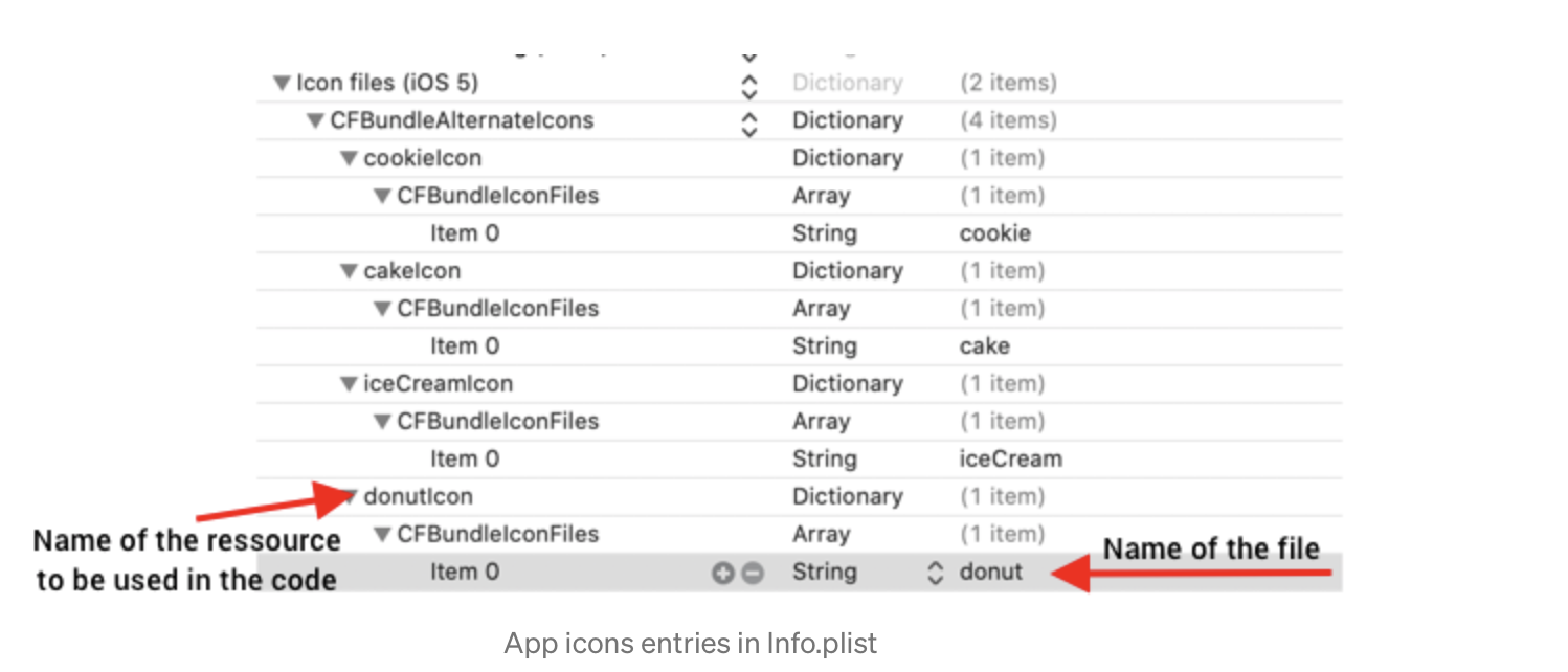 CFBundleAlternateIcons条目在Info.plist中为每个备用图标,在infos.plist文件中添加一个新条目,在CFBundleAlternateIcons下面。条目的名称是稍后将在Xcode项目中使用的图标的名称,项目的字符串值是在步骤1中添加到项目中的图标文件的名称。
