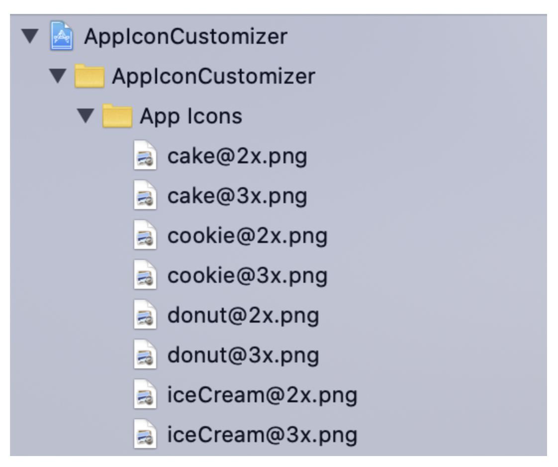 设计您的替代App,并将它们导出为两个大小:120 2x (60px @2x) 180 2x (60px @3x),将图标添加到您的项目中的一个新目录App下。请注意,备用图标文件必须位于Project目录中,而不是资产目录中。