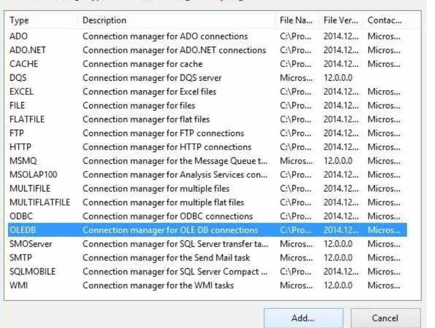 单击“新建连接管理器”选项时,将打开“添加SSIS连接管理器”窗口表单,以从给定列表中选择连接管理器。