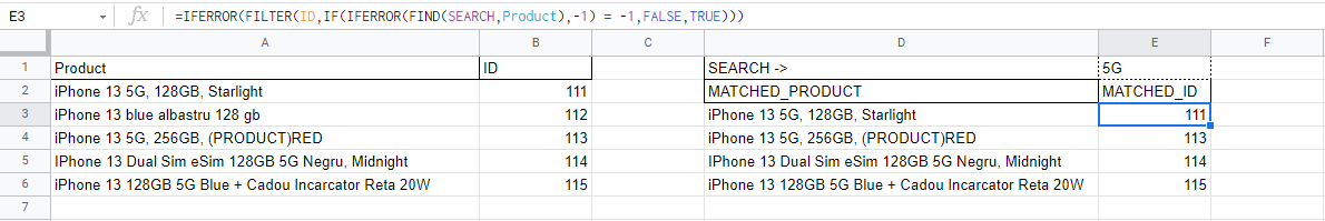 =IFERROR(FILTER(ID,IF(IFERROR(FIND(SEARCH, Product),-1) = -1,FALSE,TRUE)))