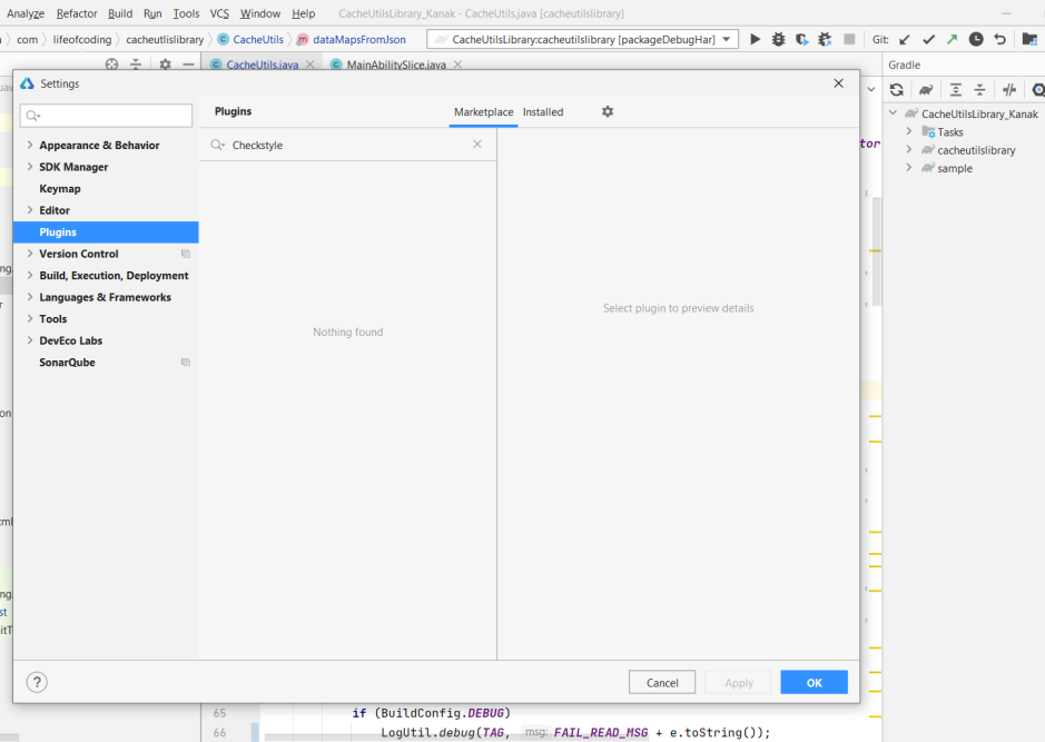 我在DevEcoStudio -主菜单->文件->Settings->Plugins->SearchCheck样式中执行的步骤,如下图所示,结果是Nothing ->