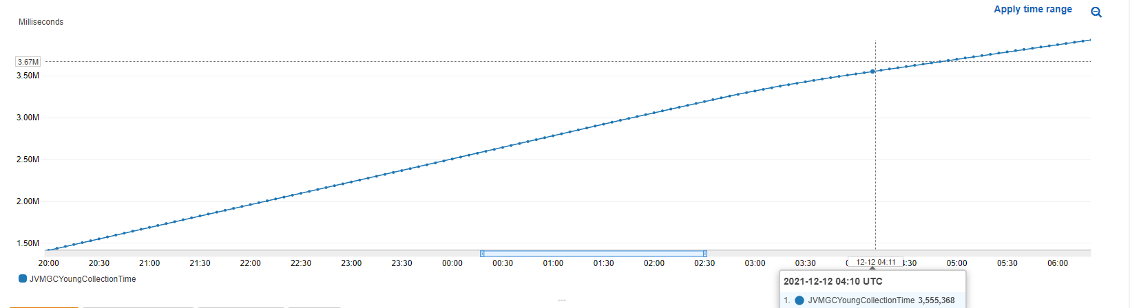 顶部的图表报告聚合GC收集时间,这是从GarbageCollectorMXBean获得的。它继续增加,因为每一个年轻一代的收集增加了。在下面的图表中,你可以看到很多年轻一代的收藏正在发生。