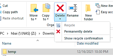 在我的Windows10 Pro中,我使用资源管理器中的“映射网络驱动器”连接到我的NAS。但是,当我尝试删除这个共享文件夹中的某些内容时,它总是使"delete永久“,循环选项是灰色的(见下图)。