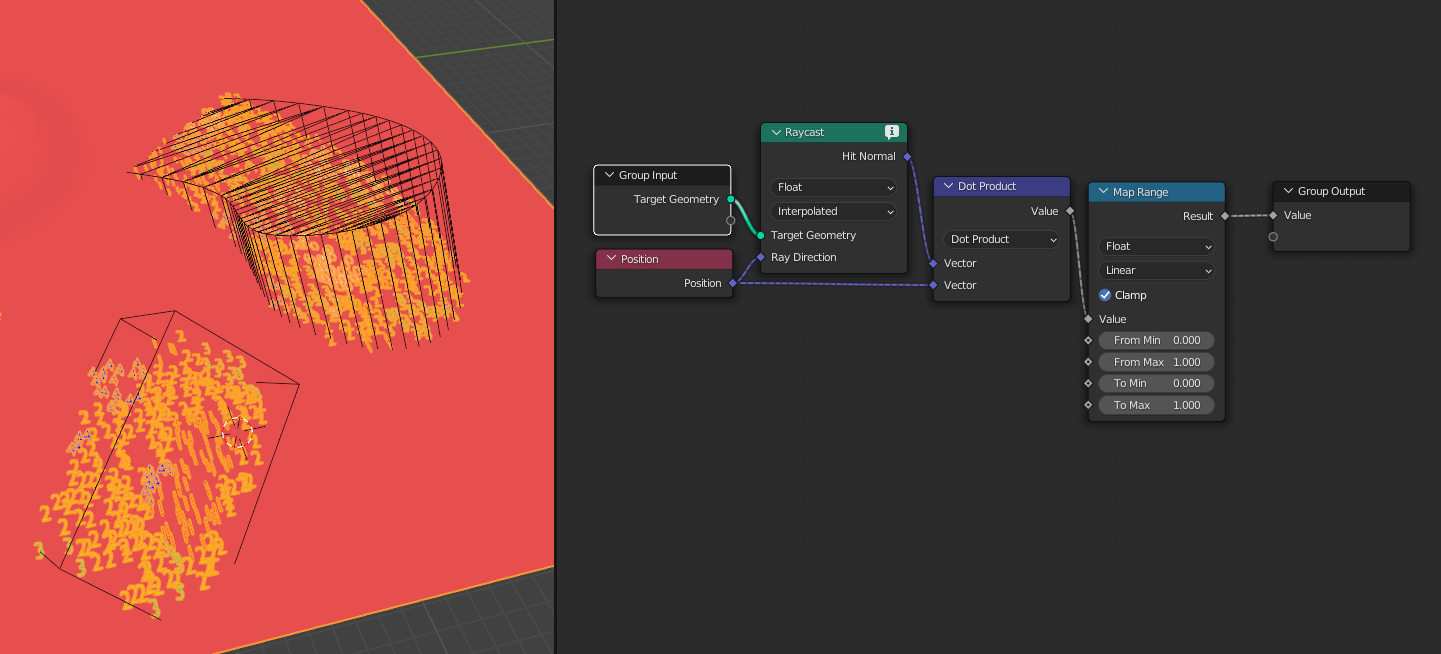 只需使用Raycast节点和位置节点来评估点产品,然后添加带有钳位复选框的映射范围。