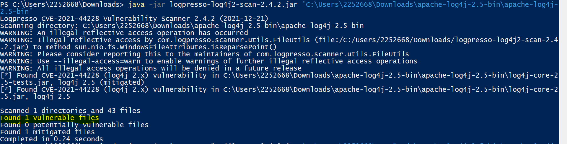 我使用jar版本扫描应用程序。从:https://github.com/logpresso/CVE-2021-44228-Scanner/releases/download/v2.4.2/logpresso-log4j2-scan-2.4.2.jar下载jar
