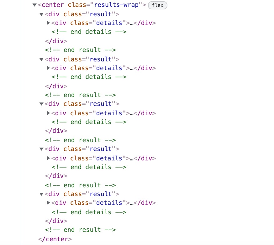 <emphasis>{subloop-array:results:-1}</emphasis>如果您能够做到这一点,那么下一步将是添加额外的div,它封装了所有的结果,每个单独的结果,然后在每个结果中详细说明。如这张截图所示