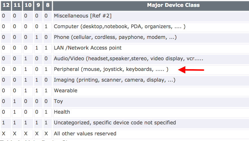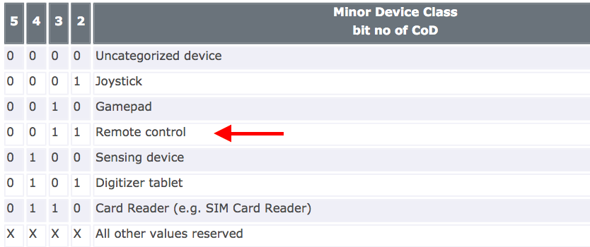 您可以自己解码蓝牙设备类(CoD),方法是首先将上面的十六进制数字转换为二进制(例如使用此链接),然后检查下面的文档,试图找出这些比特的组合意味着什么:-