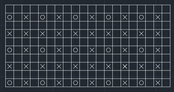 我的问题如下:我有两个或更多不同的对象(在图片中,两个对象:圆圈和交叉),每一个对象都以固定的行/列距离重复放置(在图片中,圆圈的距离为4,交叉的距离为2)。