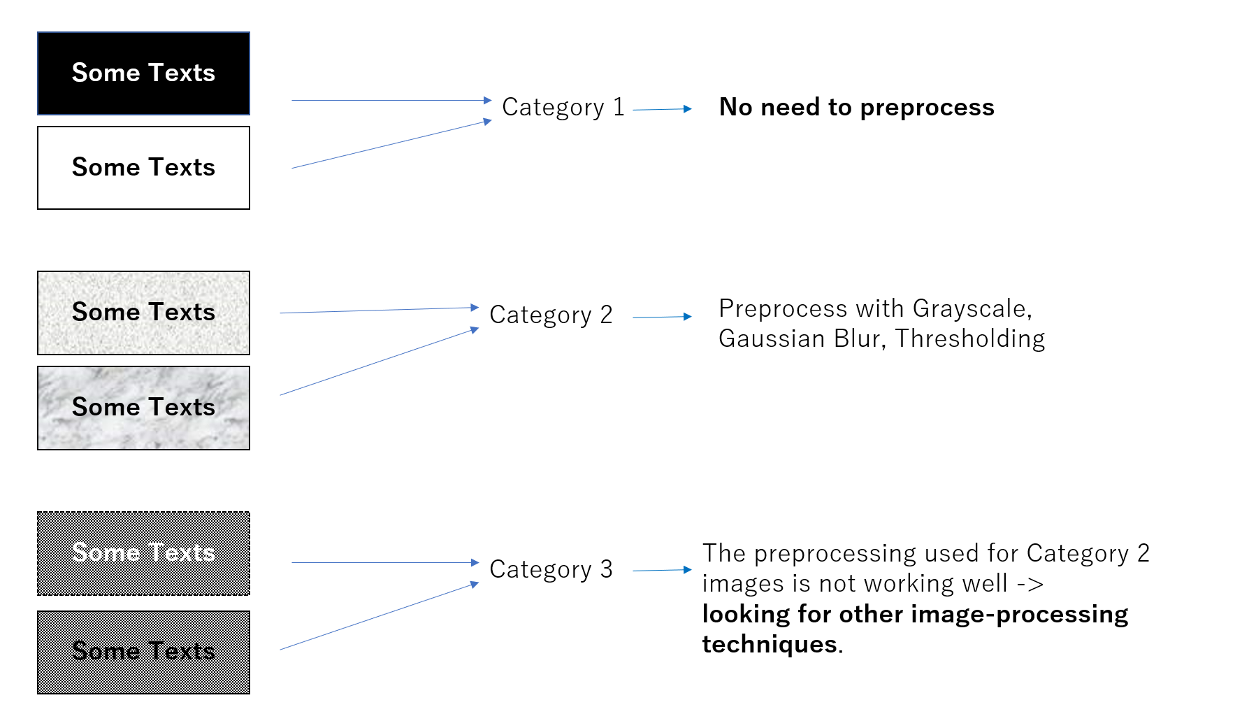 我有几种类型的图像,我需要从其中提取文本。根据背景噪声,我可以手动将图像分为3类: