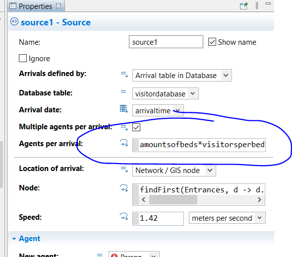 在我的源块中,我想要根据两个不同的因素获得代理的数量,即床的数量和每张床的访问者数量。每张床的访问者只是一个变量(例如,visitors=3),床的数量是从数据库表加载的,这是一个excel文件(参见第一个图像)。现在我想在代码块中编写这个代码,如图2中的示例所示,但是我不知道正确的代码,甚至不知道它是否可行。