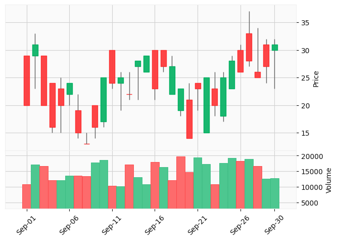 fig, axlist = mpf.plot(df, type='candle',style='yahoo',volume=True,returnfig=True)