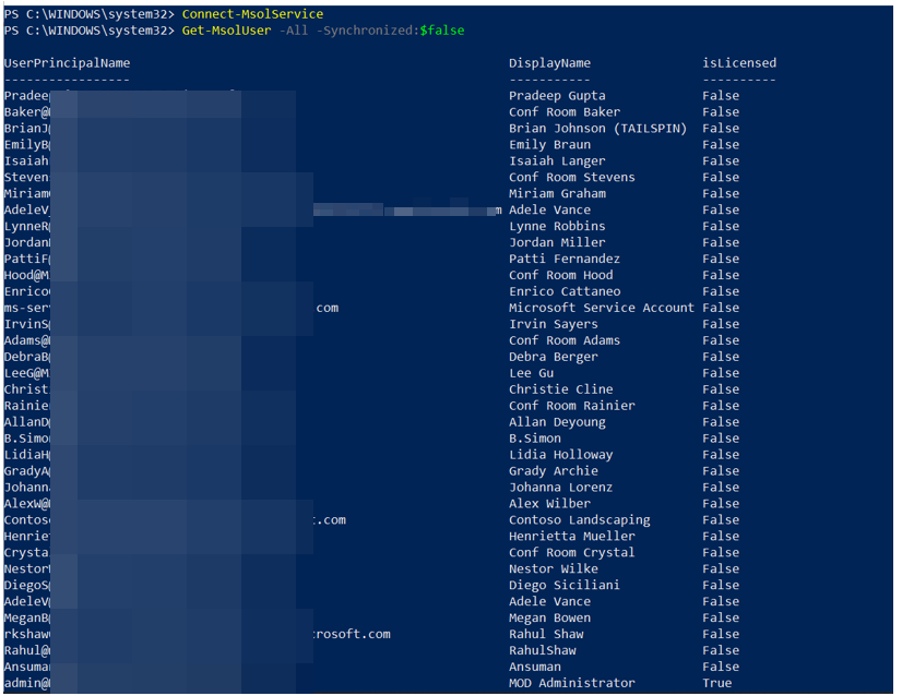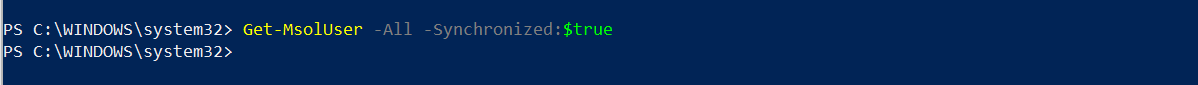 您可以使用Get-MsolUser -All -> (AzureAD user和SyncedUsers) Get-MsolUser -All -Synchronized:$false -> Azure AD用户(同步用户除外)