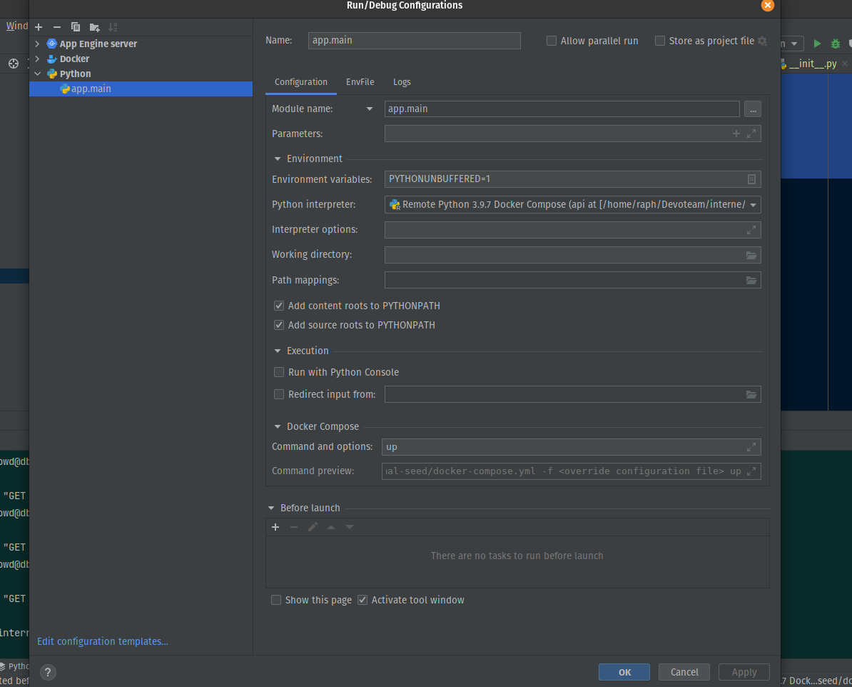 我很难在Pycharm上附加一个调试器和一个坞-组合fastAPI安装程序。