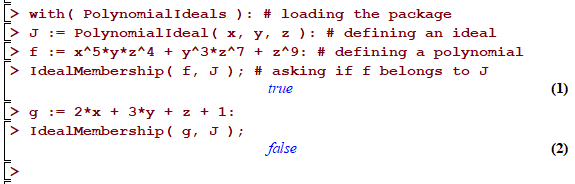 现在,如果您想要求计算机代数系统回答一个理想的成员问题。这里我用枫树写命令。您可以在IdealMembership