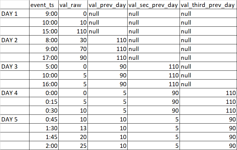 max(val_raw) over(prev_days range between 1 preceding and 1 preceding) val_prev_day,