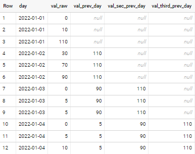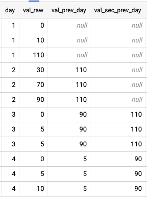 window prev_days as (order by unix_date(day)) 如果应用于样本数据,如在您的问题-输出是