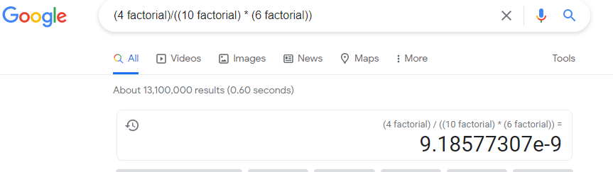 double res=Factorial_of(4) / (Factorial_of(10) * Factorial_of(abs(4-10)));