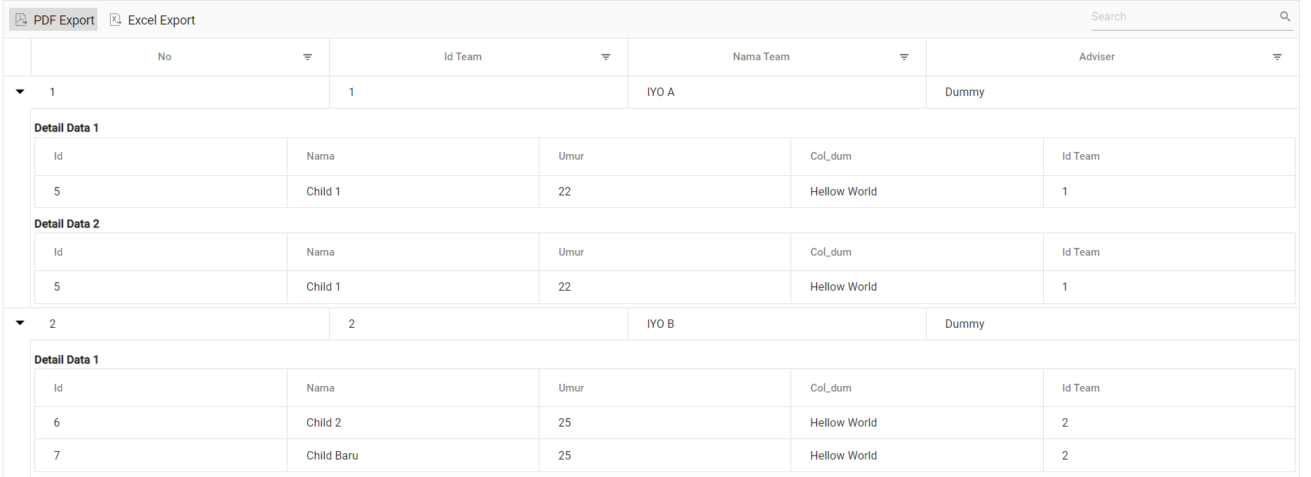 我想将数据从ej2同步反应数据网格导出到Excel和PDF,但是现有的数据有一些与每一行相关的细节。我想导出下面的数据与详细的数据到Excel和PDF。在ej2同步反应数据网格中,有什么方法可以导出带有详细行的网格吗?我尝试在Export上使用hierarchyExportMode,它不能导出详细信息行,只导出该行中的主要数据。