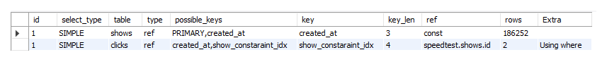 Clicks ( show_id, created_at )这两个键提供帮助的原因是索引使用了这两个部分,而不必转到原始数据页来限定记录。只有在限定之后,才需要检索结果集中的其他列。