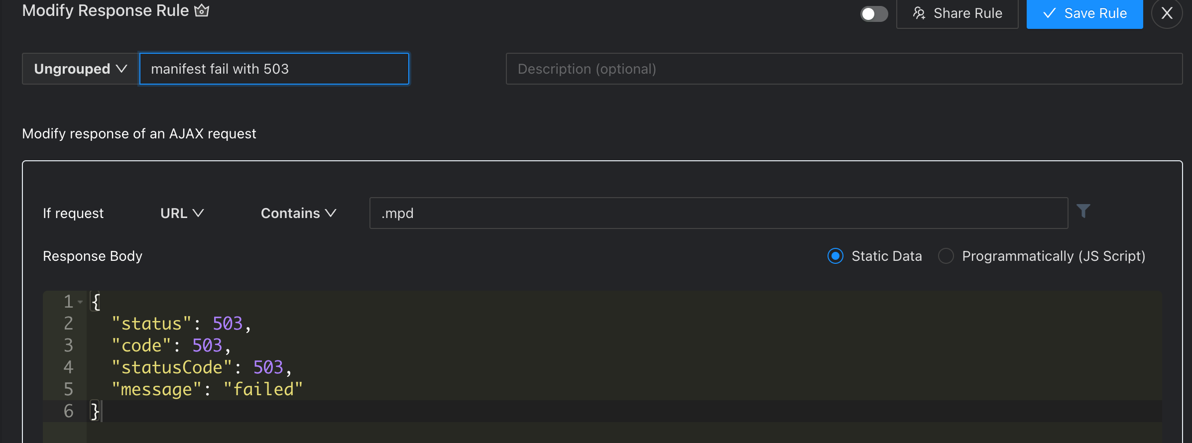 我想将HTTP代码更改为503,在.mpd结束时有一个自定义响应体。我正在使用要求镀铬扩展拦截请求,并使它失败与503。
