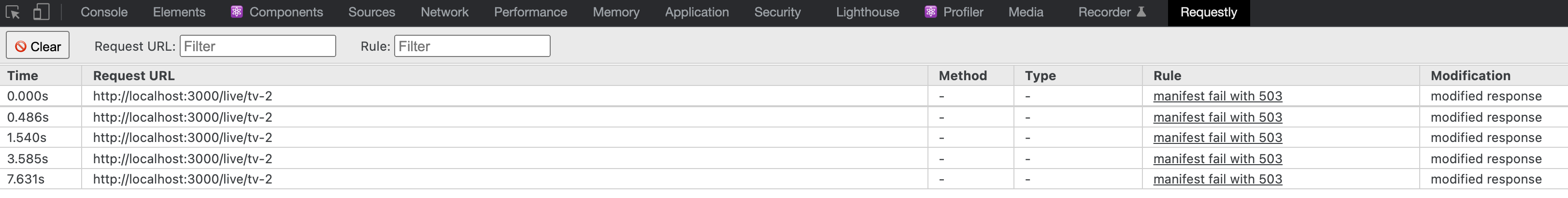 以下是devtools中的Requestly日志,它显示请求被正确截获。