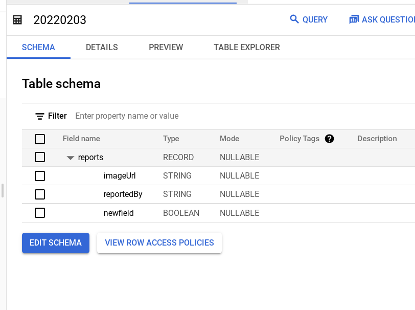 "reports array<struct<orderlineid:string,ordernumber:string,price:struct<currencycode:string,value:double>,quantity:int,serialnumbers:array<string>,sku:string>>"必需的BigQuery模式: