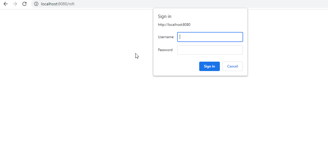 当您启动NiFi时,您将访问https://localhost:8443,并向您提供一个适当的登录表单。初始管理用户的用户名/密码将打印到nifi-app.log中: